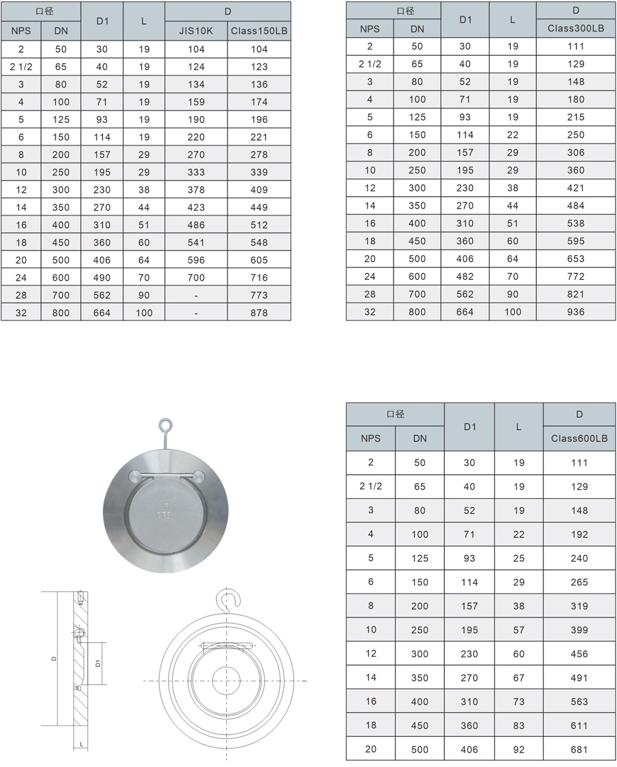 H74對夾單瓣旋啟式止回閥主要尺寸及重量